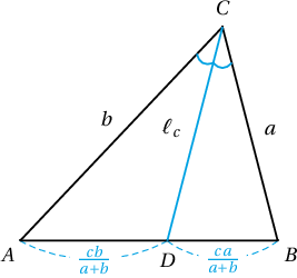 Биссектриссийн чанар: Гурвалжны өнцгийн биссектрис нь эсрэг орших талаа налсан талуудтай нь пропорционал хэсгүүдэд хуваадаг: $$\dfrac{AC}{AD}=\dfrac{BC}{BD}$$ Иймд хуваагдсан хэсгүүдийн урт нь $AD=bx$, $BD=ax$ байна. Түүнчлэн $AD+BD=c$ тул $x=\dfrac{c}{a+b}$ байна.