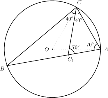 Бодолт: Синусын теоремоор $AC=2\cdot 6\cdot\sin 30^\circ=6$ байна. Биссектрис тул $\angle ACC_1=40^\circ$, $\angle A=70^\circ$ тул $ACC_1$ гурвалжны үлдсэн өнцөг нь $$\angle AC_1C=180^\circ-70^\circ-40^\circ=70^\circ$$
