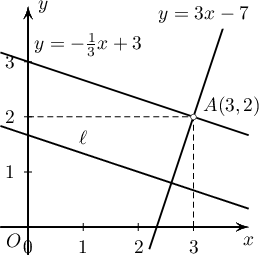 $A(3,2)$ цэгийг дайрсан $\ell\colon x+3y-5=0$ шулуунтай параллель шулууны тэгшитгэл $y=-\dfrac{1}{\fbox{a}}x+\fbox{b}$, перпендикуляр шулуун тэгшитгэл $y=\fbox{c}x-\fbox{d}$ байна.