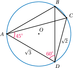 Тойрогт багтсан $ABCD$ дөрвөн өнцөгтийн $AD=\sqrt3$, $CD=\sqrt2$ ба $\angle ADB=60^\circ$, $\angle CAD=45^\circ$ бол