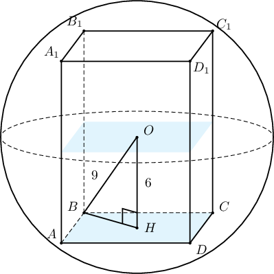 Бодолт: Призмийн суурийн төвөөс бөмбөрцгийн төв хүртэлх зай $\dfrac{12}{2}=6$ байна. Пифагорын теоремоор суурийн диагоналийн хагас нь $$\sqrt{9^2-6^2}=\sqrt{45}=3\sqrt{5}$$