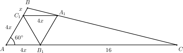 Бодолт: $C_1A_1\parallel AC$ тул $\triangle BC_1A_1\sim\triangle BAC$ байна. $C_1B=x$ гэвэл $\dfrac{AC_1}{C_1B}=4$ тул $AC_1=4x$ ба $AC_1A_1B_1$ ромбо тул $C_1A_1=4x$ ба $AC=AB_1+B_1C=4x+16$ байна. Нөгөө талаас төсөөгийн харьцаагаар