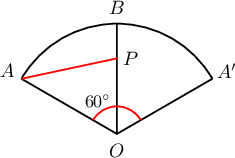 $AB$ нь $O$ оройтой конусын суурийн диаметр бөгөөд, уг конусын байгуулагч нь суурийн радиусаас 3 дахин урт байв. Хэрвээ суурийн радиус нь $r$, $P$ нь $BP=r$ байх $OB$ хэрчим дээрх цэг бол конусыг $OA$ байгуулагчийн дагуу дэлгэсэн дэлгээсийн төв өнцөг нь $\fbox{abc}^\circ$ байна. $A$ цэгээс конусын гадаргуугийн дагуу явж $P$ цэг хүрэх хамгийн дөт замын урт нь $\sqrt{\fbox{d}}r$ байна.