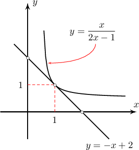 тул $y(1)=\dfrac{1}{2\cdot1-1}=1$ ба $y^\prime(1)=\dfrac{-1}{(2\cdot1-1)^2}=-1$ байна. Иймд шүргэгчийн тэгшитгэл нь