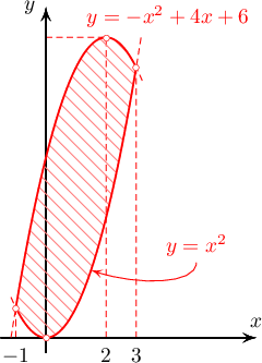 $y=-x^2+4x+6$ функцийн утгууд нь огтлолцлын $[-1;3]$ мужид $y=x^2$ функцийн утгаас их буюу график нь дээр нь байрлаж байгаа тул огтлолцолд үүсэх дүрсийн талбай нь