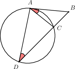 Энэ зургийн хувьд $BA^2=BC\cdot BD$ байна. Мөн нумд тулсан өнцөг нь тухайн нумд харгалзах хөвч ба хөвчийн оройд татсан шүргэгчийн хооронд үүсэх өнцөгтэй тэнцүү байна. Дээрх зургийн хувьд $\angle ADC=\angle CAB$ байна.