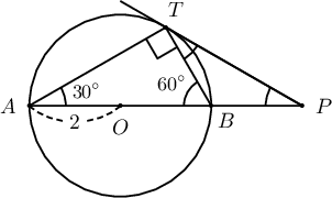 $AB$ нь $O$ цэгт төвтэй 2 радиустай тойргийн диаметр байв. Зурагт үзүүлсэн $PT$ шүргэгч шулуун татахад $\angle BAT=30^\circ$ байв.