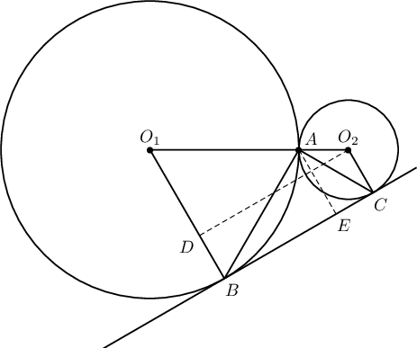 - Хэрэв $\angle AO_1B=\alpha$ гэвэл $\angle O_1AB=\dfrac{\pi}{2}-\dfrac{\alpha}{2}$, $\angle AO_2C=\pi-\alpha$, $\angle O_2AC=\dfrac{\alpha}{2}$ байна. Иймд $$\angle BAC=\pi-(\angle O_1AB+\angle O_2AC)=\dfrac{\pi}{2}$$ байна.