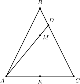 $BCE$ гурвалжин ба $AD$ шулууны хувьд Менелайн теорем бичвэл: $$\dfrac{CD}{DB}\cdot\dfrac{BM}{ME}\cdot\dfrac{EA}{AC}=1\Leftrightarrow \dfrac{4}{1}\cdot\dfrac{BM}{ME}\cdot\dfrac{1}{2}=1$$ тул $BM:ME=1:2$ байна.