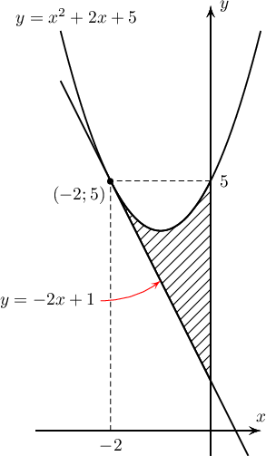 $y=x^2+2x+5$ параболын $(-2;5)$ цэгт татсан шүргэгч шулуун, $x=0$ шулуун ба уг параболын хооронд үүсэх дүрсийн талбайг ол.