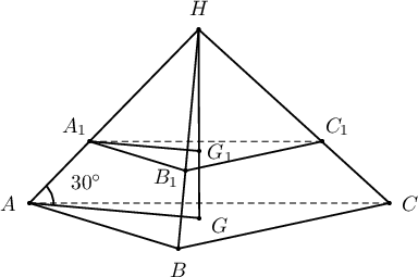 $6$ талтай зөв гурвалжны оройгоос төв хүртэлх зай $AG=\dfrac{\sqrt3\cdot 6}{3}=2\sqrt3$ ба энэ гурвалжнаар сууриа хийсэн хажуу ирмэг нь суурьтай $30^\circ$ өнцөг үүсгэх пирамидын өндөр нь