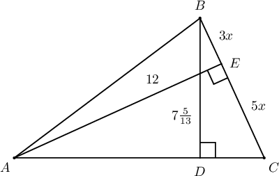 $ABC$ хурц өнцөгт гурвалжны $BD$, $AE$ өндрүүд харгалзан $7\dfrac5{13}$см, $12$см урттай бөгөөд $\dfrac{|BE|}{|EC|}=\dfrac35$ бол $AC=?$