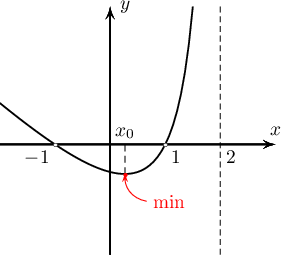 тэнцэтгэл бишийн шийд нь $x\in]-\infty;2-\sqrt3[\cup]2+\sqrt3;+\infty[$ нь $y=\dfrac{1-x^2}{x-2}$-ийн буурах муж тул $x_0=2-\sqrt3$ нь минимумын цэг байна.