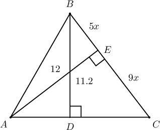 $ABC$ хурц өнцөгт гурвалжны $BD$, $AE$ өндрүүд харгалзан $11.2$см, $12$см урттай бөгөөд $\dfrac{|BE|}{|EC|}=\dfrac59$ бол $AC=?$