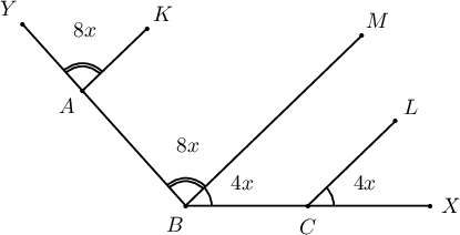 Өгөгдсөн зурагт $AK\parallel CL$, $\angle A=8x$, $\angle C=4x$, $\angle B=132^\circ$ бол $\angle BCL$ хэдтэй тэнцүү вэ?