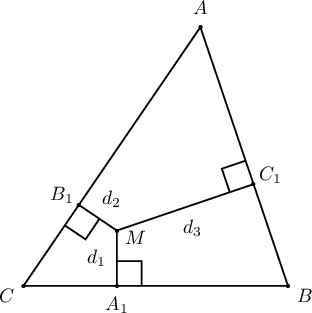 $ABC$ гурвалжны дотор орших $M$ цэгээс $BC$, $CA$, $AB$ талуудад татсан перпендикулярын сууриуд нь харгалзан $A_1$, $B_1$, $C_1$ ба $MA_1=d_1$, $MB_1=d_2$, $MC_1=d_3$ бол
