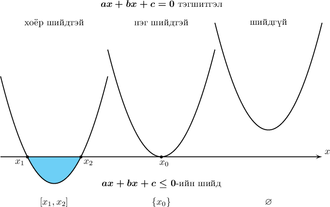 - $ax+bx+c=0$ тэгшитгэл $x_0$ гэсэн цор ганц шийдтэй бол $ax+bx+c\le 0$ тэнцэтгэл бишийн шийд $\{x_0\}$ байна.