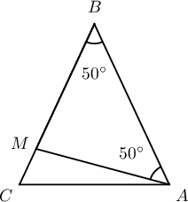 $ABC$ адил хажуут гурвалжны оройн өнцөг $\measuredangle B=50^\circ$ бөгөөд $AM=BM$ байхаар $M$ цэгийг $BC$ хажуу тал дээр авсан бол $\measuredangle MAC$ өнцгийг ол.
