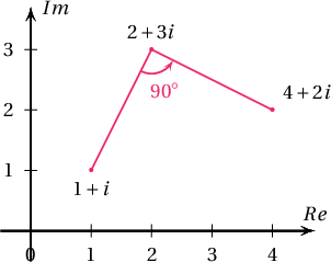 зургаас хараахад $2+3i$ цэгийг тойруулан цагийн зүүний эсрэг чиглэлд $1+i$ цэгийг $90^\circ$ өнцгөөр эргүүлэхэд $4+2i$ цэг гарч байна.