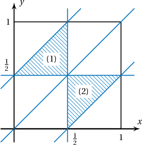 Заавар: $[0,1]$ хэрчим дээр хаясан цэгүүд нь $x$, $y$ координатуудтай байг. Хос тоо бүрийг хавтгай дээрх цэгийн координат гэж үзэж болно. $0\le x$, $y\le1$ тул $(x,y)$ цэг нь 1 талтай квадратад байрлана. Координатууд нь бодлогын нөхцөлийг хангах цэгүүд ямар дүрс үүсгэхийг ол.