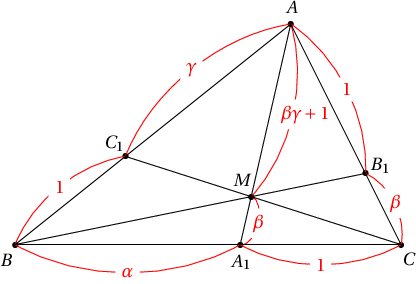 Бодолт: $A=0$ ба $(AB,C_1)=\gamma$, $(BC,A_1)=\alpha$, $(CA,B_1)=\beta$ гэе. Тэгвэл $C_1=\dfrac{\gamma B}{1+\gamma}$, $B_1=\dfrac{C}{1+\beta}$ ба