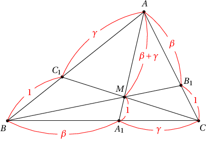 Бодолт: $A=0$ ба $(AB,C_1)=\gamma$, $(BC,A_1)=\alpha$, $(CA,B_1)=\beta$ гэе. Тэгвэл $C_1=\dfrac{\gamma B}{1+\gamma}$, $B_1=\dfrac{\beta C}{1+\beta}$ ба