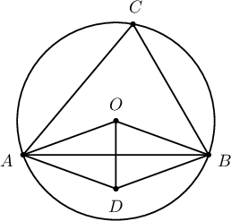Бодолт: Координатын эхийг $O$ цэг гэвэл багтаасан тойргийн тэгшитгэл $z\overline{z}=R^2$ болно. Иймд $a\overline{a\vphantom{b}}=b\overline{b}=c\overline{c\vphantom{b}}=1$, ба $AOBD$ ромбо тул $d=a+b$ байна. Иймд