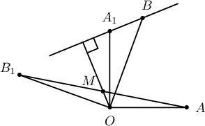 $O$ цэгийг тойруулан $AB$ хэрчмийг $90^\circ$ эргүүлэхэд $A_1$, $B_1$ хэрчим гарсан гэе. $OAB_1$ гурвалжны медиан $OM$ нь $A_1B$ шулуунд перпендикуляр гэж батал.