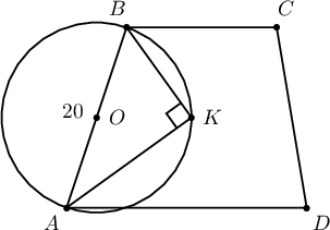 $AD$, $BC$ суурьтай $ABCD$ трапецийн $A$ ба $B$ оройн биссектрисүүдийн огтлолцлын цэг $K$ байв. $AB$ талын урт $20$ бол $ABK$ гурвалжныг багтаасан тойргийн радиусыг ол.