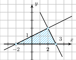 $y = \dfrac{1}{2}x-2 = 0$, $y +2x +2 = 0$, $y = 0$ тэгшитгэлтэй шулуунуудын огтлолцолд үүсэх гурвалжны талбайн хэмжээг олоорой.
