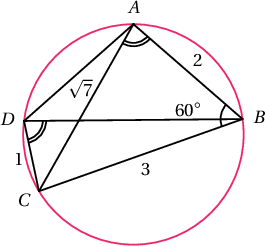 $ABC$ гурвалжинд косинусын теорем бичвэл $$\cos\angle BAC=\dfrac{(\sqrt{7})^2+2^2-3^2}{2\cdot 2\cdot\sqrt{7}}=\dfrac{\sqrt{7}}{14}$$ Нөгөө талаас $\angle BDC=\angle BAC$ болохыг тооцоод $DBC$ гурвалжинд косинусын теорем бичвэл $$3^2=1^2+BD^2-2\cdot 1\cdot BD\cdot\dfrac{\sqrt{7}}{14}$$ буюу $$BD^2-\dfrac{BD}{\sqrt{7}}-8=0$$ ба $BD>0$ тул $$BD=\dfrac{\frac{1}{\sqrt{7}}+\sqrt{\frac17-4\cdot(-8)}}{2}=\dfrac{8}{\sqrt{7}}=\dfrac{8\sqrt{7}}{7}$$ болно. Синусын теоремоор $$\dfrac{3}{\sin\angle CDB}=\dfrac{\frac{8\sqrt{7}}{7}}{\sin\angle BCD}$$ тул $$\sin\angle BCD=\dfrac{8\sqrt{7}}{21}\cdot\sin\angle CDB=\dfrac{8\sqrt{7}}{21}\cdot\sin\angle BAC=\dfrac{8\sqrt{7}}{21}\cdot\dfrac{3\sqrt{21}}{14}=\dfrac{4\sqrt{3}}{7}$$ болно. Иймд $$S_{BCD}=\dfrac12\cdot BC\cdot CD\cdot\sin\angle BCD=\dfrac{1}{2}\cdot 1\cdot 3\cdot\dfrac{4\sqrt{3}}{7}=\dfrac{6\sqrt{3}}{7}$$
