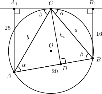 $AA_1C$ тэгш өнцөгт гурвалжнаас $b=\dfrac{25}{\sin\beta}$, $BB_1C$ тэгш өнцөгт гурвалжнаас $a=\dfrac{16}{\sin\alpha}$. Нөгөө талаас Синусын теоремоор