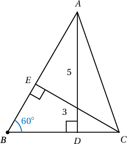 Заавар: $\measuredangle B=120^\circ$. $ADB$, $CEB$ тэгш өнцөгт гурвалжнуудаас $BA$, $BC$ талуудын уртыг олоод косинусын теорем ашиглан $AC$-г ол.