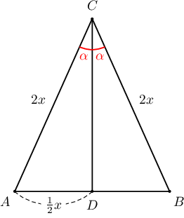 $\sin\alpha=\dfrac{\frac12x}{2x}=\dfrac14$, $\cos\alpha=\sqrt{1-\dfrac16}=\dfrac{\sqrt{15}}{4}$ тул $$\sin\measuredangle ACB=\sin2\alpha=2\cdot\dfrac14\cdot\dfrac{\sqrt{15}}{4}=\dfrac{\sqrt{15}}{8}$$