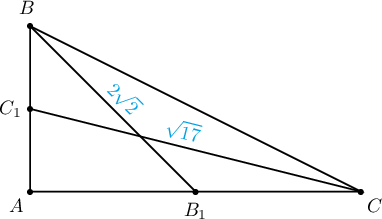 Заавар: Катетуудыг $2a$, $2b$ урттай гээд Пифагорын теорем ашигла. Өнцөг олох тул медиануудын уртыг $2\sqrt{2}$, $\sqrt{17}$ гэж үзэж болно.