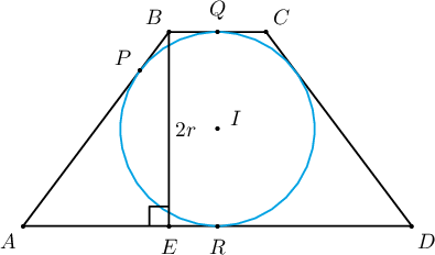 Өндөр нь $h=2r$ тул бага суурийн урт $BC=r$. Тойрог багтаасан 4 өнцөгтийн чанар ёсоор хажуу талын урт нь $\dfrac{AD+BC}{2}=\dfrac{AD+r}{2}$ байна. Бага суурийн оройгоос $BE$ өндөр татъя.