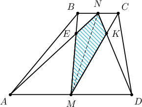 $ABCD$ трапецийн талбай $48$, $AD$ болон $BC$ сууриудын уртын харьцаа $3:1$. $BC$ суурийн дундаж цэг $N$, $AD$ суурийн дундаж цэг $M$. $AN$ ба $BM$ нь $E$ цэгт, $DN$ ба $CM$ нь $K$ цэгт огтлолцдог бол $ENKM$ дөрвөн өнцөгтийн талбайг ол.