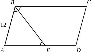 Cолбисон өнцгүүд тул $\angle FBC=\angle BFA$ тэнцүү. Мөн $BF$ биссектрис тул $\angle FBC=\angle ABF$ тул $ABF$ гурвалжны суурийн өнцөгүүд тэнцүү болно. Иймд $\triangle ABF$ адил хажуут гурвалжин болно. Иймд $AF=AB=12$. $AF:FD=4:3$ тул $FD=\dfrac{3AF}{4}=9$ болно. Иймд $AD=AF+FD=12+9=21$ болов. Иймд параллелограммын периметр