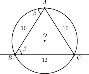 Заавар: Талуудынх нь урт нь $10$, $10$, $12$ байх адил хажуут гурвалжныг багтаасан тойргийн радиусыг олох юм.
