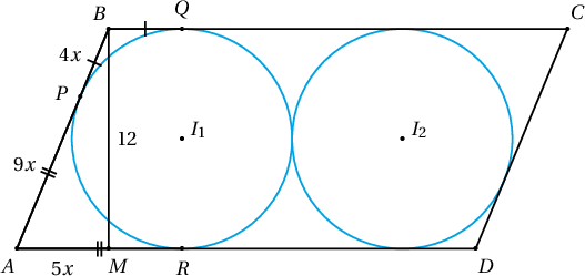 Заавар: $I_1$ төвтэй тойргийг $AB$ тал $P$ цэгт шүргэдэг, $BC$, $AD$ талууд харгалзан $Q$, $R$ цэгүүдэд шүргэдэг гэе. $AP:PB=9:4$ тул $AP=AR=9x$, $BP=BQ=4x$ болно. $B$ оройгоос $AD$ талд өндөр буулгаад суурийг $M$ гэе. Тэгвэл $MR=BQ=4x$ тул $AM=9x-4x=5x$, $BM=2\cdot 6=12$ байна. $AMB$ тэгш өнцөгт гурвалжинд Пифагорын теорем бичвэл