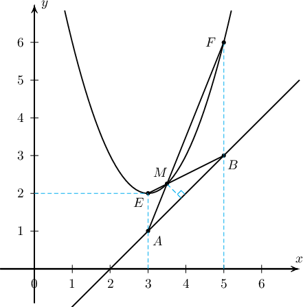 Зургаас $AEFB$ нь трапец болох нь харагдаж байна ($AM$, $BM$ шулуунуудын тэгшитгэлийг бичээд параболтой огтолцох цэгүүд нь $E(3,2)$, $F(5,6)$ болохыг тогтоосноор баталж болно). Трапецийн диагоналуудаар үүсэх хоёр хажуу талд тулсан гурвалжнуудын талбай тэнцүү тул $\dfrac{S_{\triangle AMB}}{S_{\triangle FME}}=1$ байна.