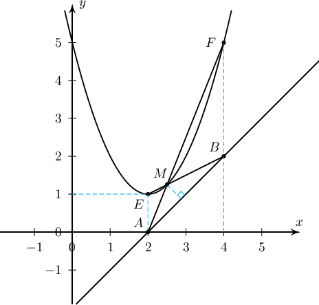 Зургаас $AEFB$ нь трапец болох нь харагдаж байна ($AM$, $BM$ шулуунуудын тэгшитгэлийг бичээд параболтой огтолцох цэгүүд нь $E(3,2)$, $F(5,6)$ болохыг тогтоосноор баталж болно). Трапецийн диагоналуудаар үүсэх хоёр хажуу талд тулсан гурвалжнуудын талбай тэнцүү тул $\dfrac{S_{\triangle AMB}}{S_{\triangle FME}}=1$ байна.