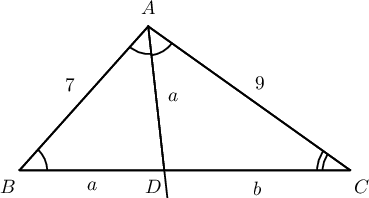 $AC=9$, $AB=7$ нэгж урттай $ABC$ гурвалжны $A$ оройн дотоод өнцгийн биссектрис нь $AD=DB$ байхаар $BC$ талтай $D$ цэгт огтлолцсон бол $BC$ талын уртыг ол.