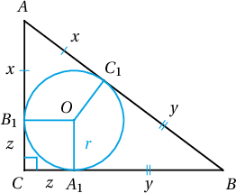 байдаг. Үнэндээ тойргийн гадна орших цэгээс тойрогт татсан шүргэгчийн уртууд тэнцүү тул $z+x=b$, $z+y=a$, $x+y=c$ ба тэгш өнцөгт гурвалжны хувьд $r=z$ байна.
