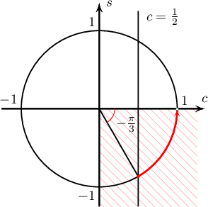 Зураг дээр $c=\frac12$ шулуунаас баруун тийш орших нумд харгалзах өнцгүүд нь $\frac12\le\cos x$ тэнцэтгэл бишийн шийдүүд бөгөөд $\big[-\frac\pi2; 0\big]$ дахь өнцгүүд нь IV мужийн өнцгүүд улаан дэвсгэртэй хэсэг эдгээрийн огтлолцол нь улаан нум буюу шийдийн муж байна. $x=0$ үед $\cos x=1$ тул шийд болохгүй. Иймд тэнцэтгэл бишийн шийд нь $\big[-\frac\pi3; 0\big[$ байна.
