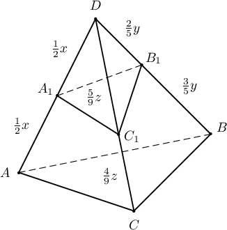 2-р чанар ёсоор $\dfrac{V_{A_1BCD}}{V_{ABCD}}=\dfrac12$, $\dfrac{V_{A_1B_1CD}}{V_{A_1BCD}}=\dfrac25$, $\dfrac{V_{A_1B_1C_1D}}{V_{A_1B_1CD}}=\dfrac59$ байна. Эдгээрийг үржүүлбэл: $$\dfrac{V_{A_1B_1C_1D}}{V_{ABCD}}=\dfrac{1}{2}\cdot\dfrac{2}{5}\cdot\dfrac{5}{9}=\dfrac19$$ байна.
