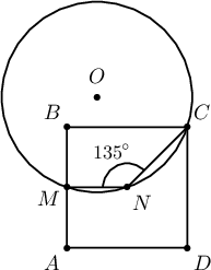 Бодолт: $AB$ талын дундаж цэг нь $M$ гэвэл $MC=\sqrt{2^2+4^2}=2\sqrt5$. Квадратын төв $N$ бол $\measuredangle MNC=135^\circ$ байна. Синусын теорем хэрэглэж $\triangle MNC$-г багтаасан тойргийн радиусыг олъё:
