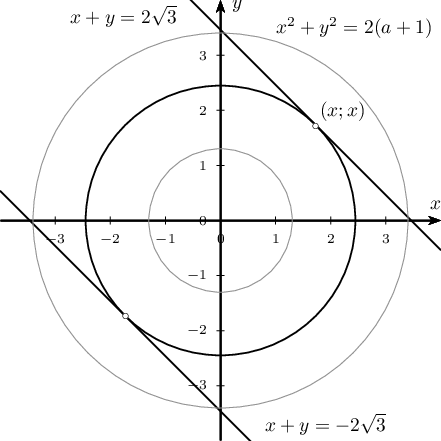 $\left\{\begin{array}{c}(x+y)^2=12\\x^2+y^2=2(a+1) \end{array}\right.$ систем тэгшитгэл яг хоёр шийдтэй байх $a$ параметрийн утгуудыг ол.