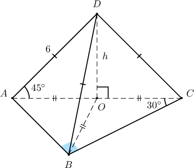 - Гипотенузын урт $$AC=2AO=2\cdot 6\cos45^\circ=2\cdot 3\sqrt2=6\sqrt2.$$ Катетууд нь $6\sqrt2\sin30^\circ=3\sqrt2$, $6\sqrt2\cos30^\circ=3\sqrt6$. Талбай нь: $$S=\frac12\cdot 3\sqrt2\cdot 3\sqrt6=9\sqrt3.$$