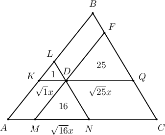 $$AM:MN:NC=KD:MN:DQ=\sqrt{1}:\sqrt{16}:\sqrt{25}=1:4:5$$ тул $AC:AM=AC:KD=10:1$ болно. Иймд $$S_{ABC}:S_{KLD}=10^2:1^2\Rightarrow S_{ABC}=100$$